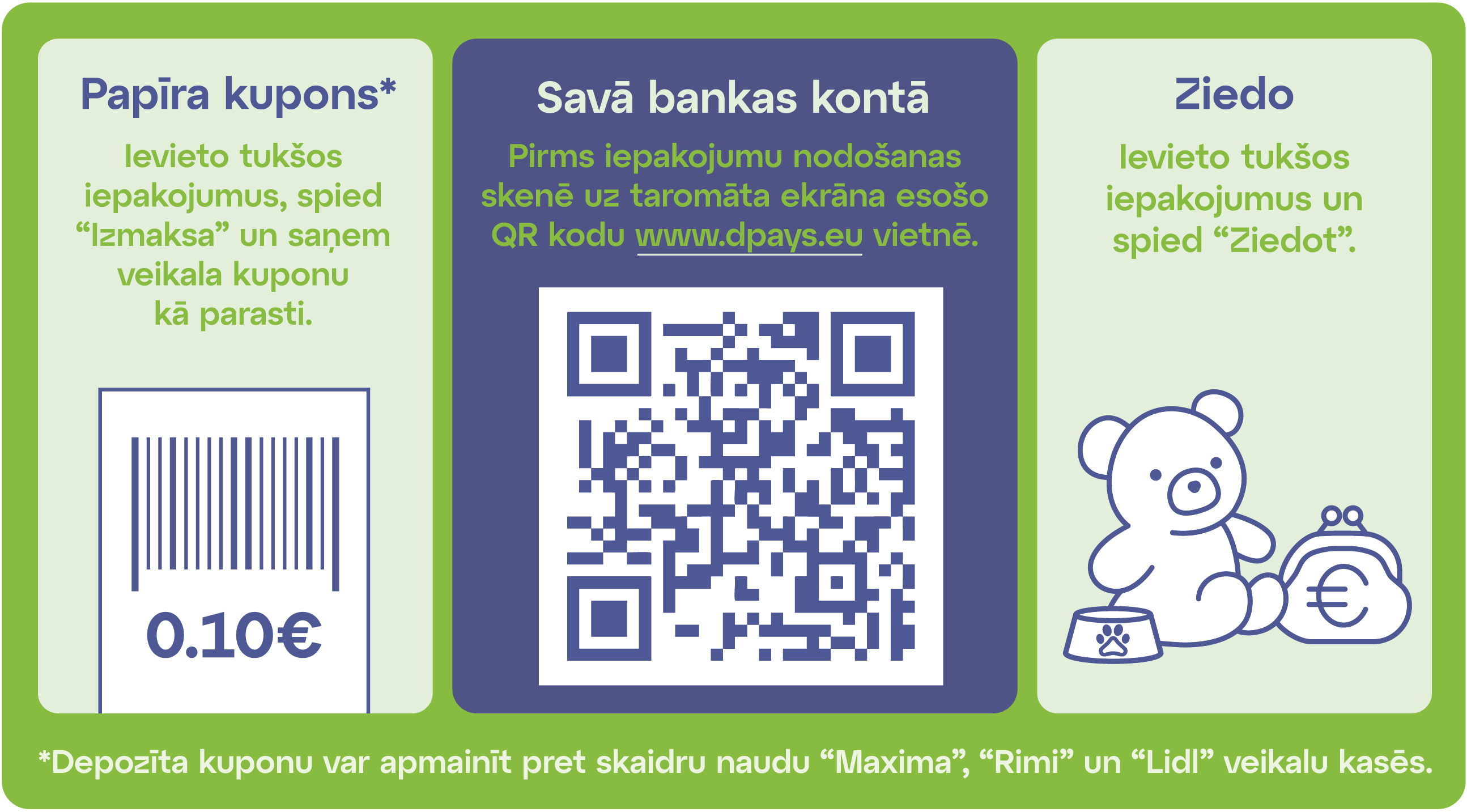 The donation project is implemented in partnership with Ziedot.lv, the largest and most experienced charity organisation in Latvia. All the donated deposit payment goes to Ziedot.lv, which is responsible for the administrative function of the project and directs the funds to the appropriate charitable direction. As part of the donation project, it is also planned to communicate about the funds allocated to charity, informing about it through press releases and social networks.