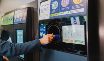 Lai nodotu tukšos depozīta iepakojumus automātiskajā pieņemšanas vietā, ievietojiet tos taromātā pa vienam ar apakšējo daļu pa priekšu. Kad visi līdzi paņemtie depozīta iepakojumi ir nodoti taromātā, spiediet uz ekrānā redzamās pogas, lai pabeigtu darbību un saņemtu depozīta kuponu par nodotajām iepakojuma vienībām. Izmantojiet depozīta kuponu pirkuma apmaksai kuponā norādītajā veikalā.* Kupons izmantojams kā maksāšanas līdzeklis jebkādu veikalā pieejamo preču iegādei.